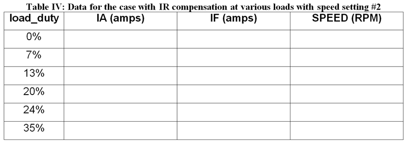 With the motor running push the “IR_Comp_On” button to turn on the IR compensation feature and then repeat the measurements described in the previous section using Table III and Table IV to record the data. Here is a print version (PDF) of the tables shown below.